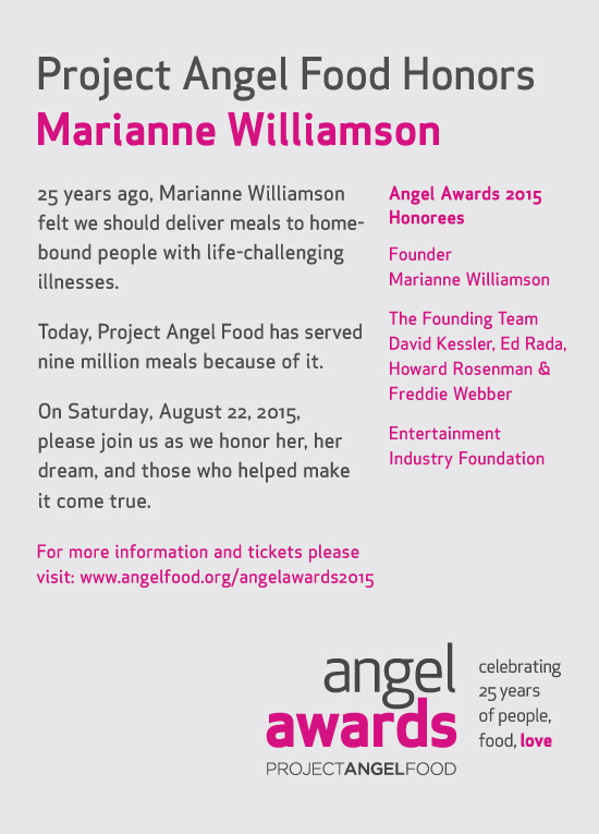 I’m very moved that at this year’s Angel Awards, Project Angel Food has chosen to celebrate its 25th anniversary by honoring me and others on our founding team. I hope you will join me in making this a magnificent celebration of what’s possible, contributing in whatever way you can to an organization that was born in love, and continues to extend love, in a way that touches individual lives every single day. It would mean the world to the organization, and it would mean the world to me.